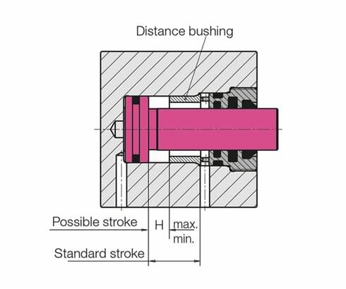 Extending of the piston can be limited by the installation of a distance bushing. The minimum stroke shortening is between 3 and 8 mm, depending on the size, and the smallest possible stroke between 1 and 10 mm.