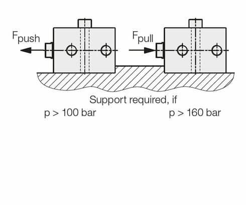 All block cylinders can be fixed with screws of tensile strength 8.8. When fastened across the cylinder axis, block cylinders must be supported depending on the operating pressure.