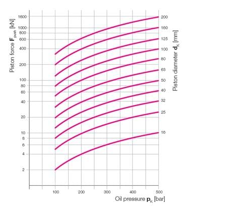 The graph on the right side shows the relation between oil pressure, piston force and piston diameter.