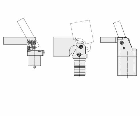 La pinza de palanca plana está disponible en versiones de simple o doble efecto. El pistón se mueve hacia arriba contra el borde posterior de la palanca de sujeción y la gira hasta la posición de sujeción.