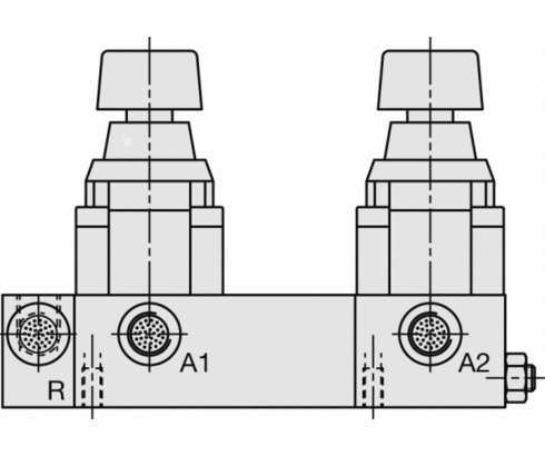 Con esta combinación de válvulas pueden accionarse cilindros de doble efecto. Con el pomo giratorio se acciona una válvula distribuidora 3/2 y una placa de válvulas intermedia y obtiene la función de doble efecto. La construcción de placas de montaje permite la combinación con unidades de simple efecto.