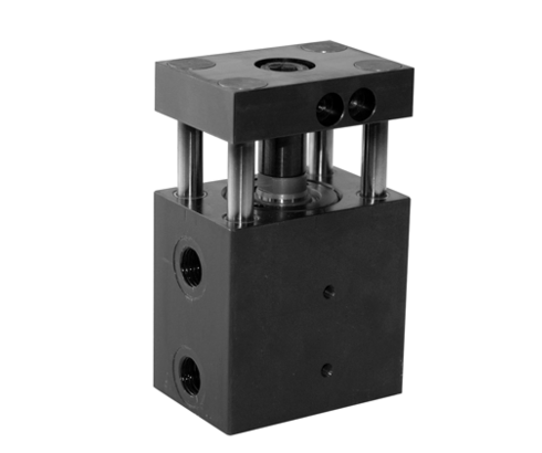 La mini-corredera RM es un cilindro tipo bloque compacto, con 4 columnas de guía integradas que pueden compensar también fuerzas transversales y momentos de torsión. En la placa frontal pueden practicarse roscas para la fijación de cargas útiles o herramientas. Para evitar un punto de contusión posible entre la placa frontal y el cilindro se debe observar la distancia de seguridad de 25 mm según DIN EN 349.