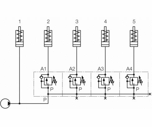 4. La presión de aceite aumenta uniformemente en todos los cilindros, ya que ahora la válvula de secuencia tiene paso libre.